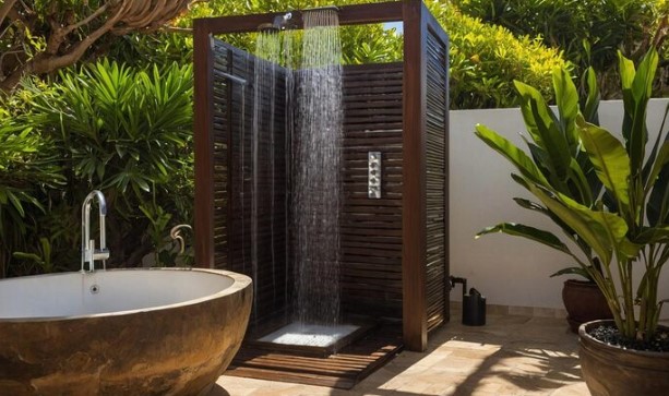 An outdoor shower enclosure with roof provides extra privacy and weather protection but is optional depending on climate and preference.